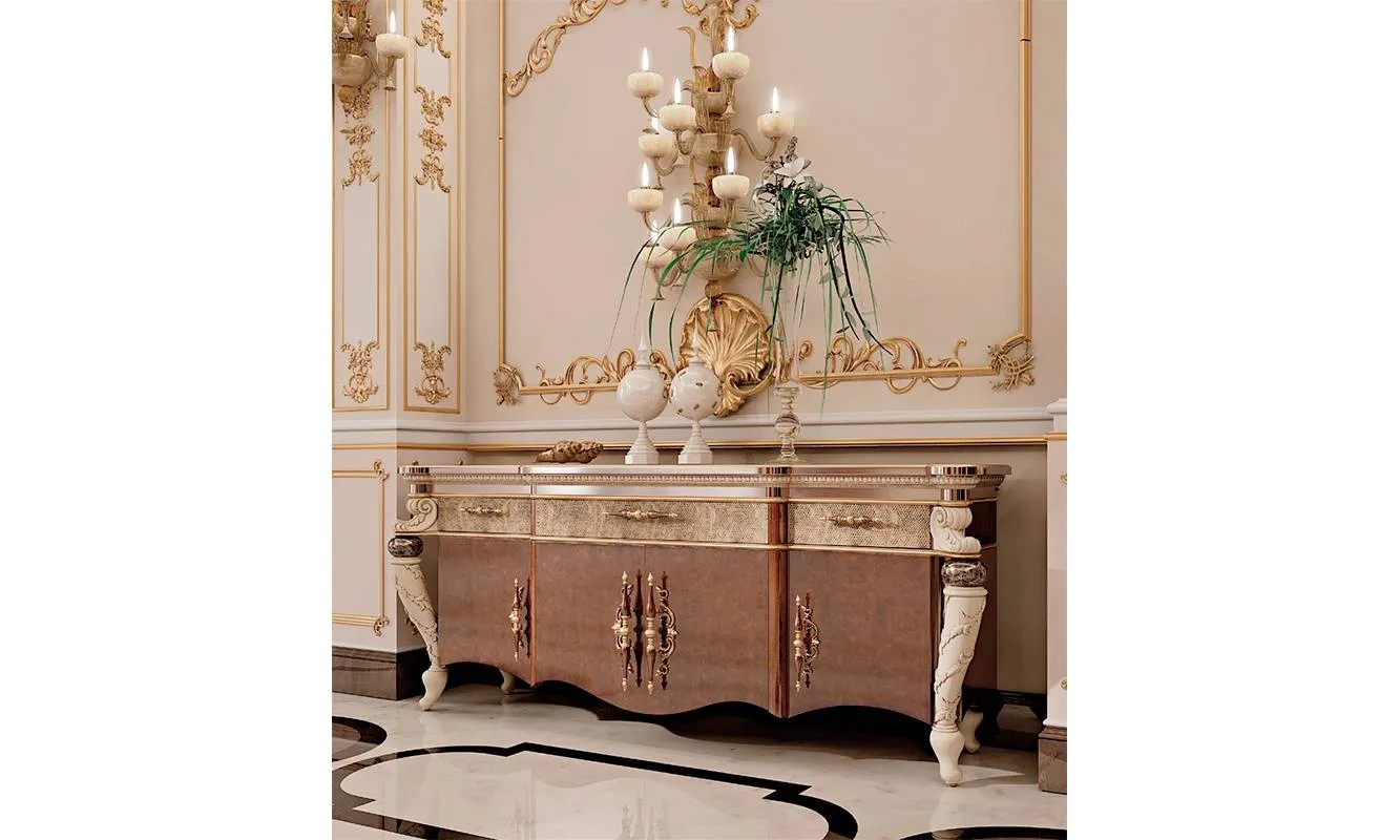 Буфет с тремя ящиками и четырьмя . Декорирован резными деревянными ножками и сферами из мрамора.