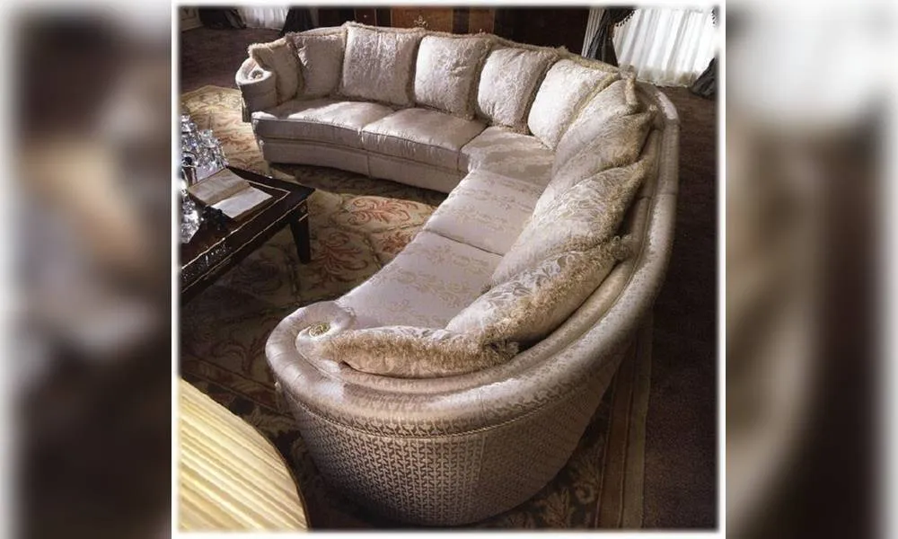 Угловой диван с закругленной спинкой плавно переходящей в подлокотники. Золоченые ножки. Наполнение - полиуретан. Декор ручной работы. Возможны другие цветовые варианты обивки.