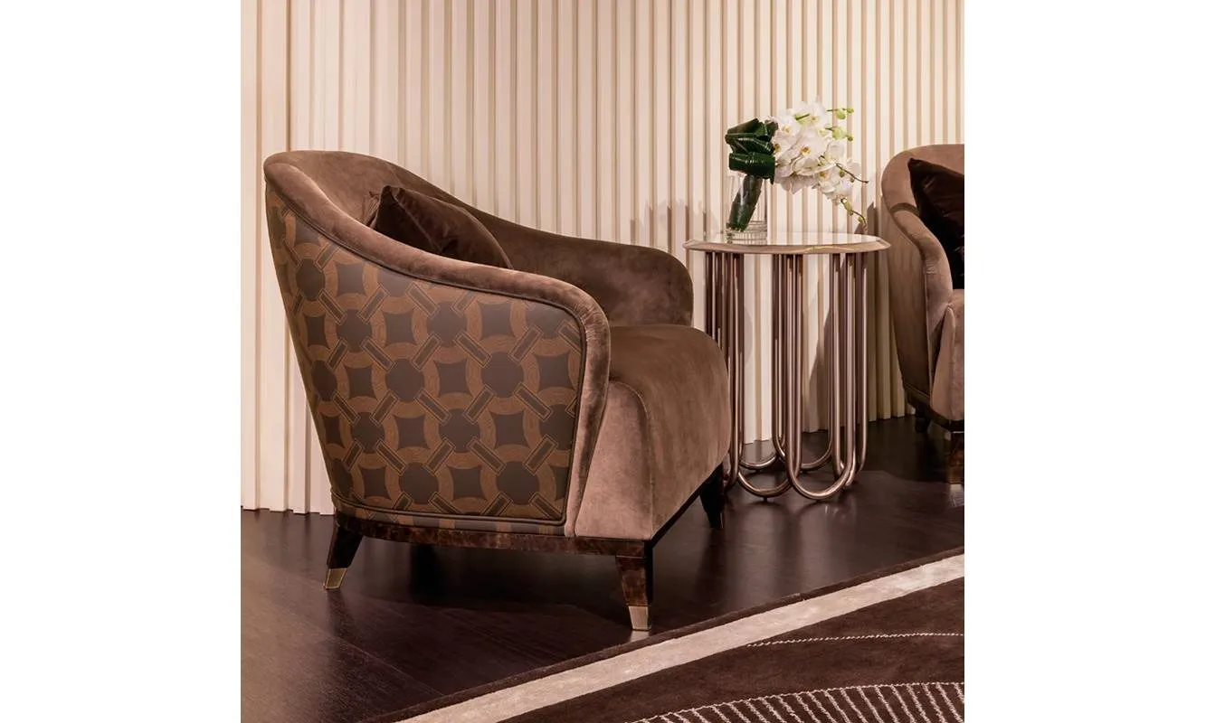 Кресло на ножках с металлическими опорами в золотом оттенке. Структура выполнена из дерева. Обивка может быть изготовлена из ткани или кожи разных видов.