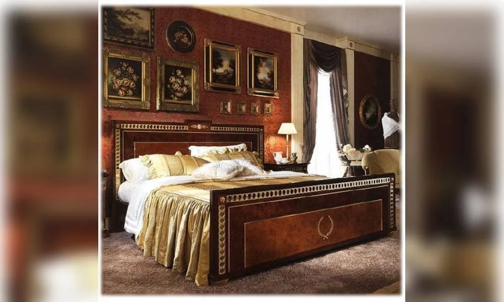 Двуспальная кровать. Высокое изголовье с изножьем (возможен вариант кровати без изножья). Декоративные металлические детали со встроенными затененными зеркалами. Декор ручной работы. Возможны другие цветовые варианты отделки.