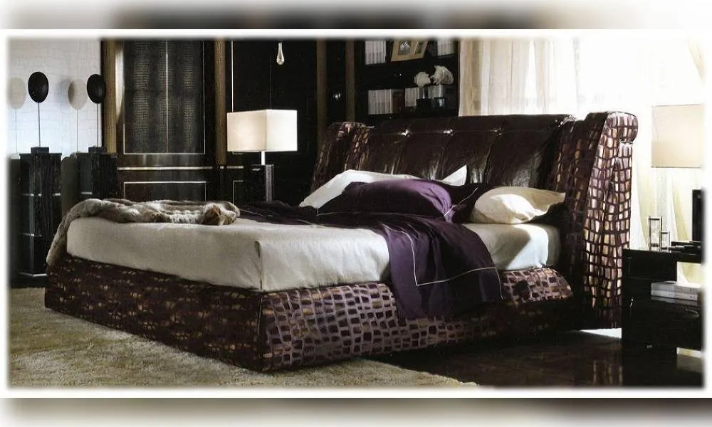 Двуспальная кровать в мягкой обивке. Высокое и мягкое изголовье c накидкой из кожи, без изножья. Возможны другие варианты обивки.