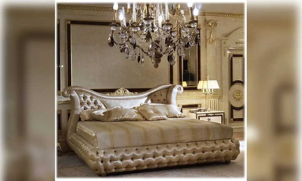 Двуспальная кровать в мягкой обивке. Высокое и мягкое изголовье, без изножья. Возможны другие варианты обивки.