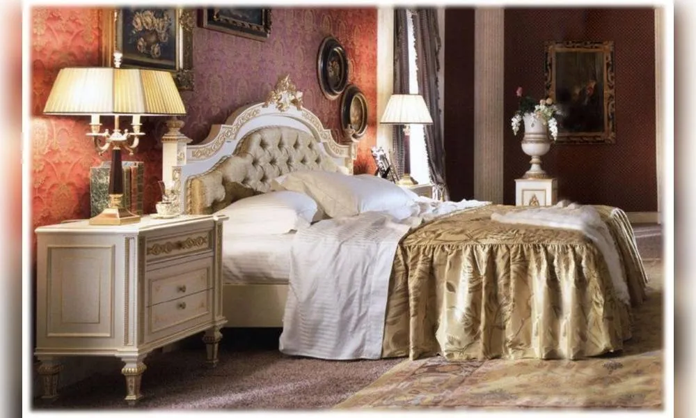 Двуспальная кровать, украшена резьбой. Высокое и мягкое изголовье, без изножья. Декор ручной работы. Возможны другие цветовые варианты отделки и обивки.