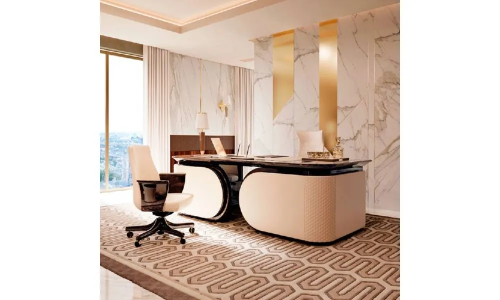 Письменный стол руководителя с открытой фронтальной частью. Выполнен из ценных пород дерева и частично обит кожей. Возможны другие варианты обивки и отделки, в том числе выполнение стола с закрытой фронтальной частью. Есть вариант выполнения углового стола.