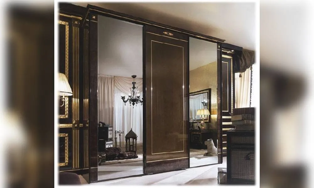 Шкаф с 3-мя раздвижными дверцами. Боковые дверцы с гравированным фацетным зеркалом. По запросу возможно все 3 дверцы зеркальные или деревянные. Внутреннее оснащение: 3 полки и 4 золоченных вешалки. Декор ручной работы. Возможны другие цветовые варианты отделки.