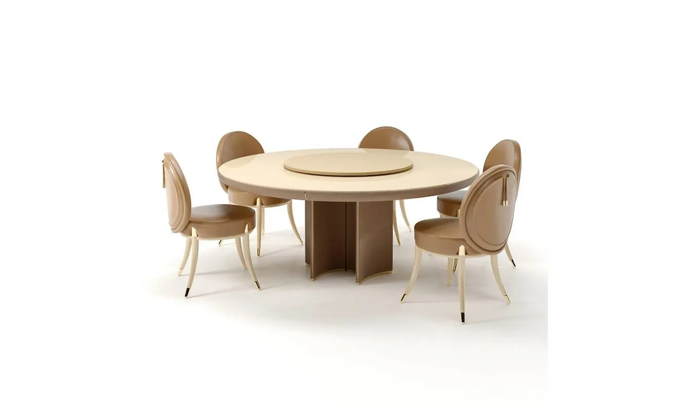 Круглый стол с вращающейся сервировочной тарелкой. Структура выполнена из дерева с кожаной обивкой, возможны другие варианты ее выполнения.