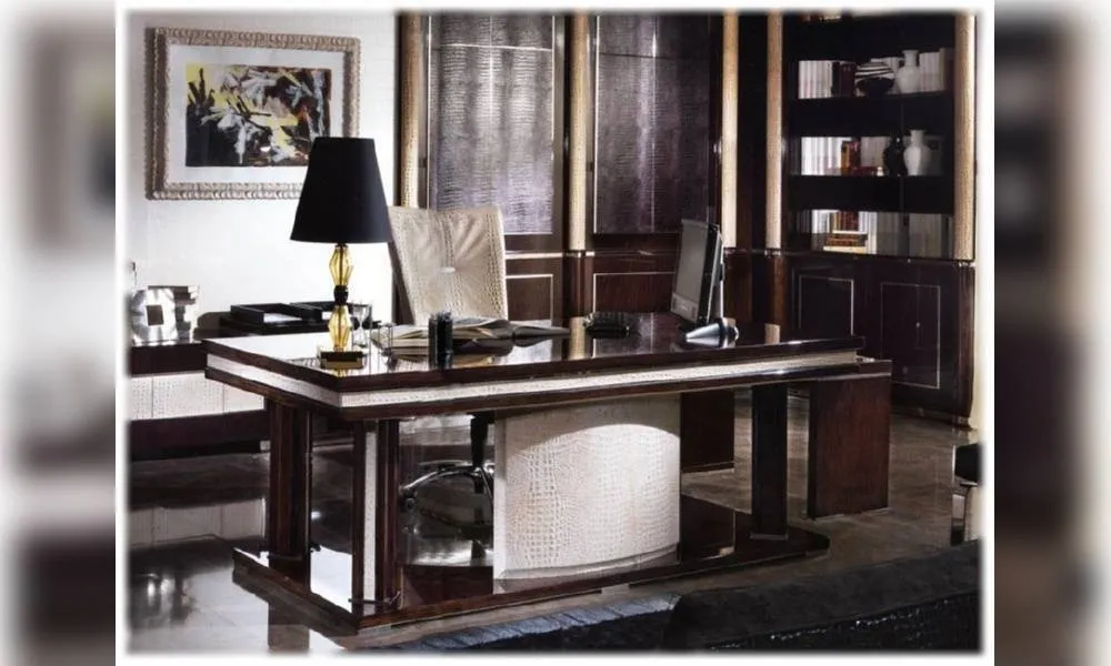 Письменный стол. Декорирован кожаной аппликацией. Декор ручной работы. Возможны другие цветовые варианты отделки.