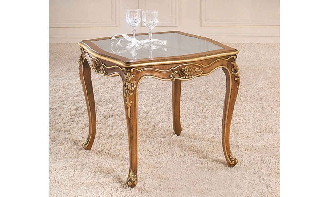 Приставной столик. Столешница выполнена из стекла. Декорирован резными элементами.