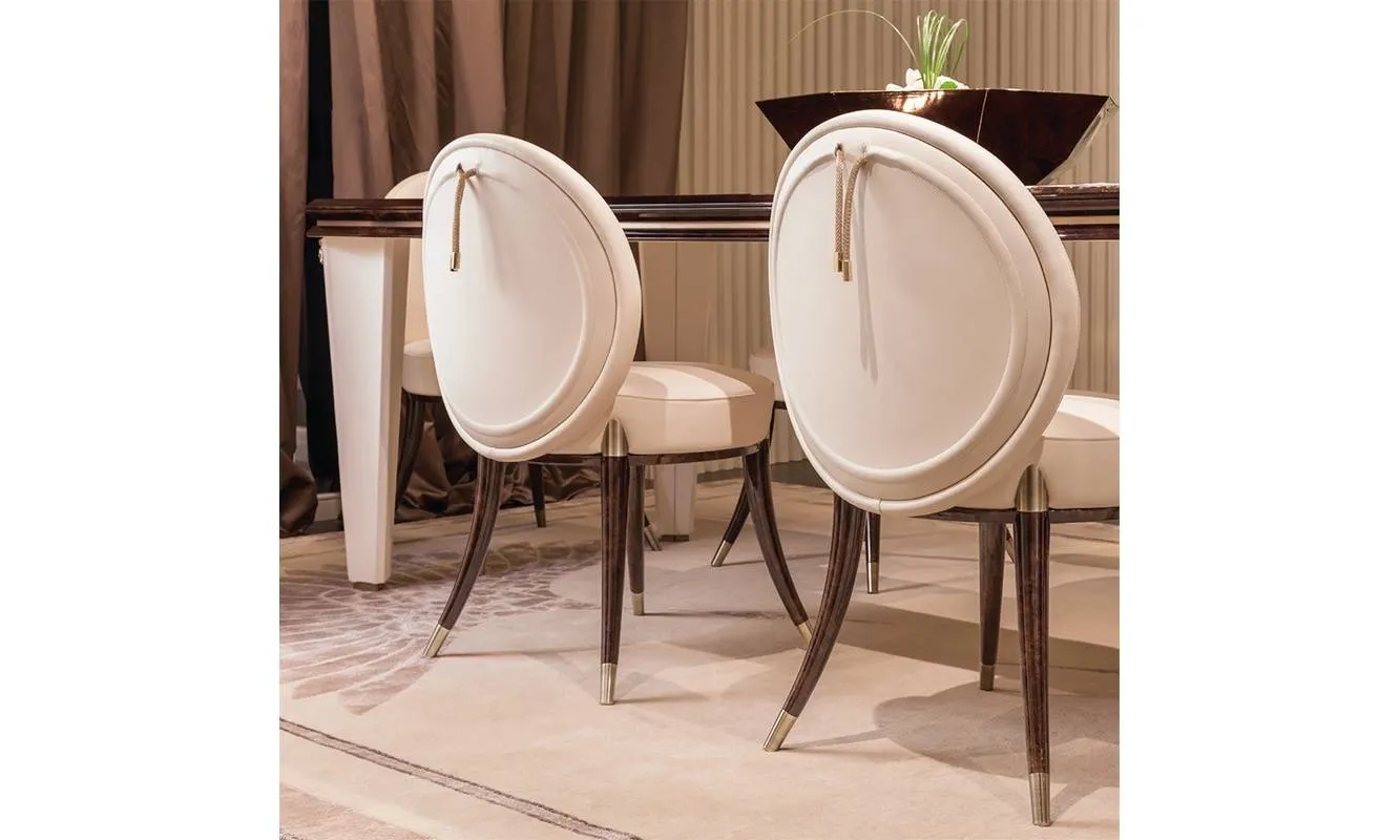 Стул на деревянных ножках, декорирован металлическими вставками и шнурком по периметру спинки. Обивка может быть выполнена из ткани или кожи разных видов.
