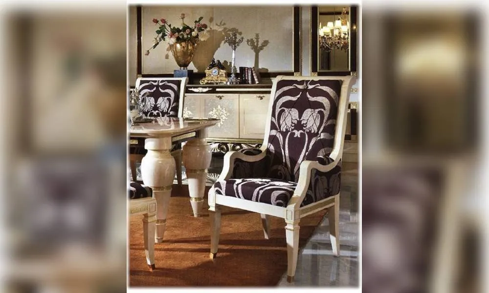 Стул с подлокотниками, высокая и мягкая спинка. Декор ручной работы. Возможны другие цветовые варианты отделки.