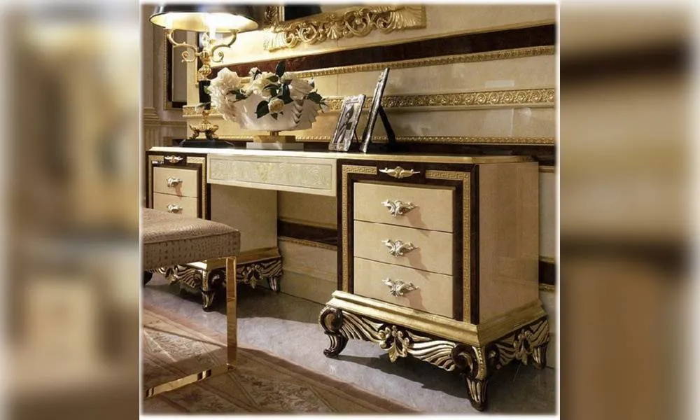 Туалетный столик с 7-ю выдвижными ящиками, декорирован резьбой. Декор ручной работы. Возможны другие цветовые варианты отделки.