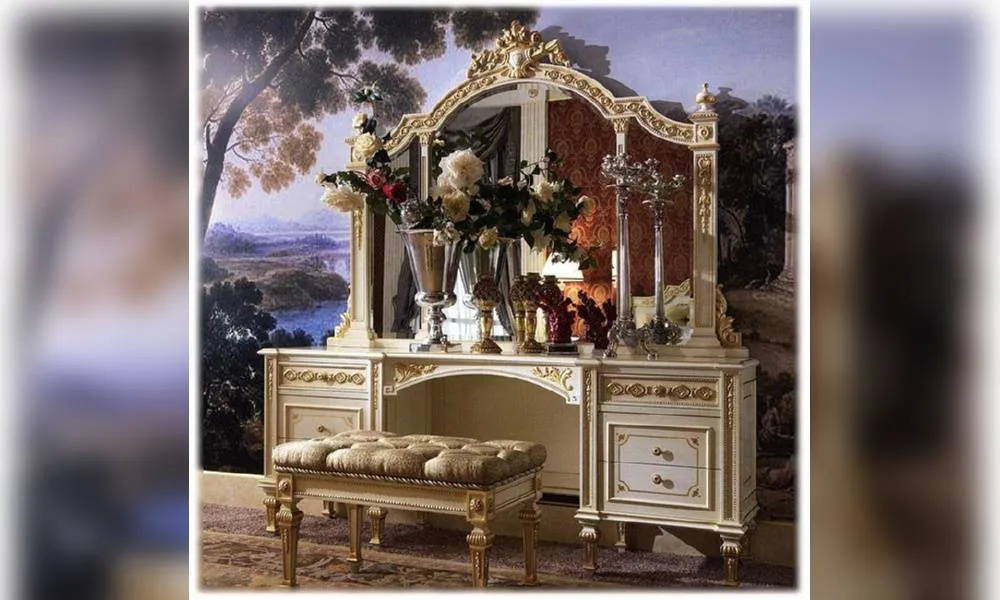 Туалетный столик с 6-ю выдвижными ящиками и зеркалом. Зеркало c периметральным фацетом. Декор ручной работы. Возможны другие цветовые варианты отделки.