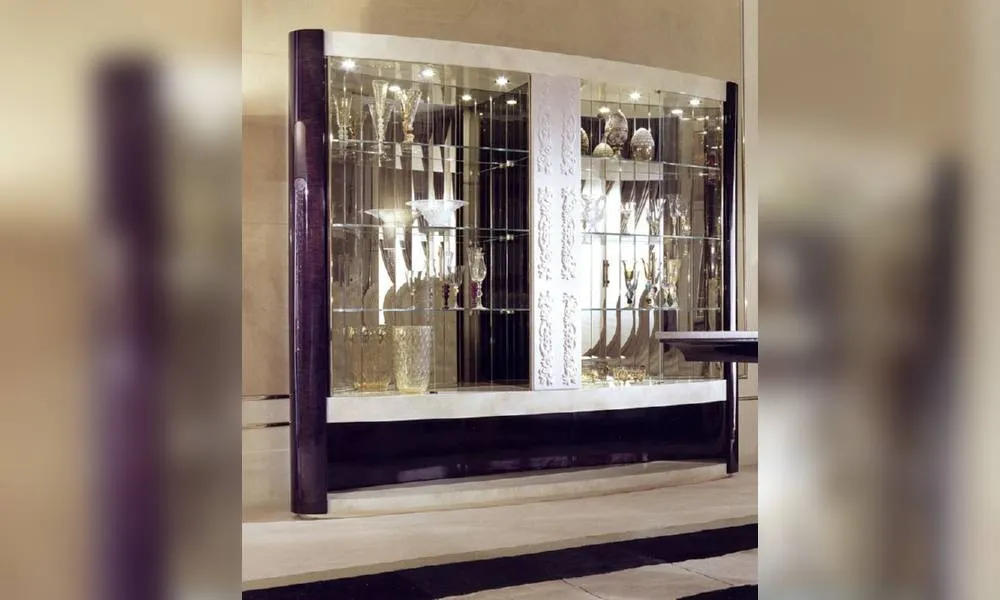 4-х дверная витрина из закаленного стекла. Украшена декоративной резьбой ручной работы. Зеркальная задняя стенка. Рельефная часть в коже. Подсветка в верхней части возможна по запросу. Возможны другие варианты отделки.