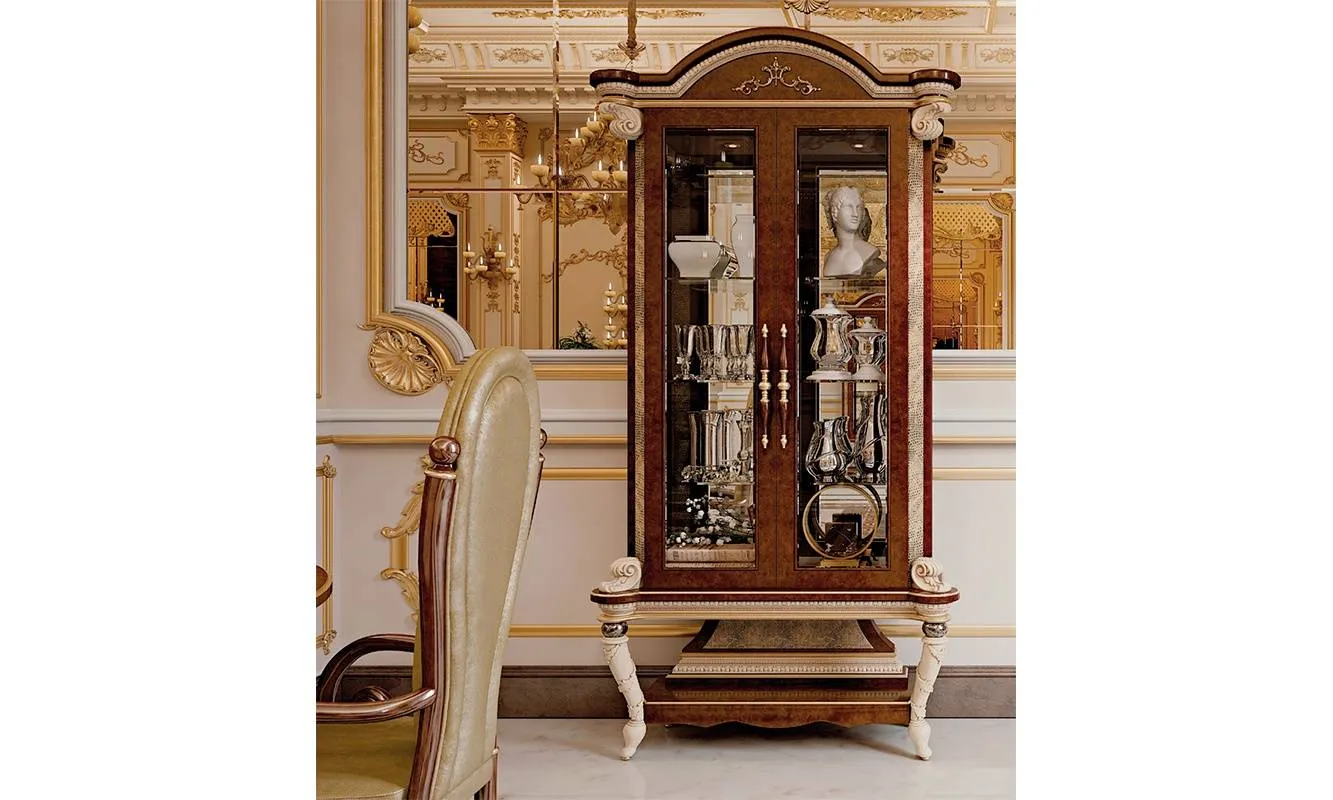 Витрина с деревянной структурой и стеклянными дверцами. Декорирована резьбой и сферами из мрамора.